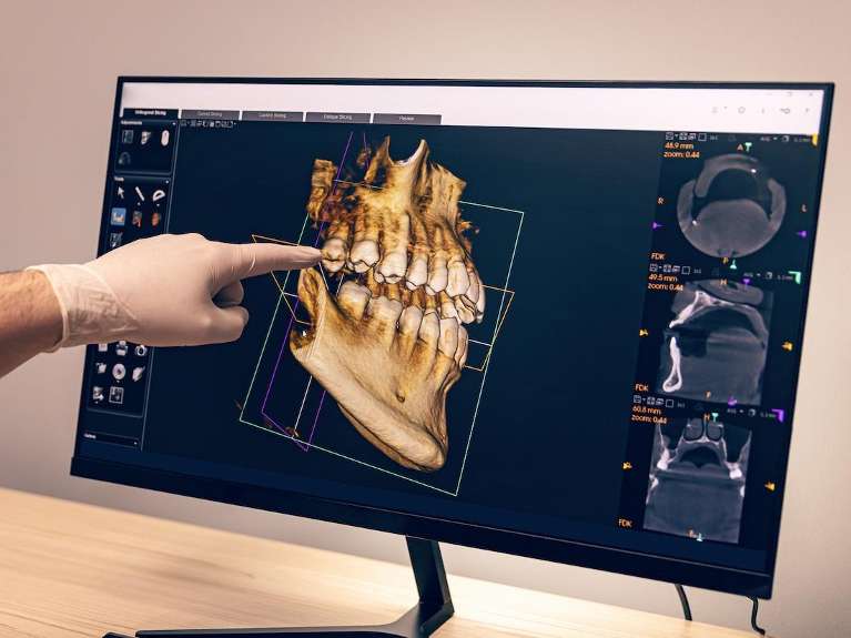 CBCT creates detailed 3-D images of teeth, bone, nerves, and soft tissues in a single scan. This advanced imaging allows Dr. Vazquez to precisely plan treatments like implant placement, evaluate bone density, and perform complex reconstructions. The comprehensive view enhances diagnostic accuracy and treatment outcomes, particularly for dental implants, bone grafting, sinus lifts, and complex extractions, all while using minimal radiation exposure.